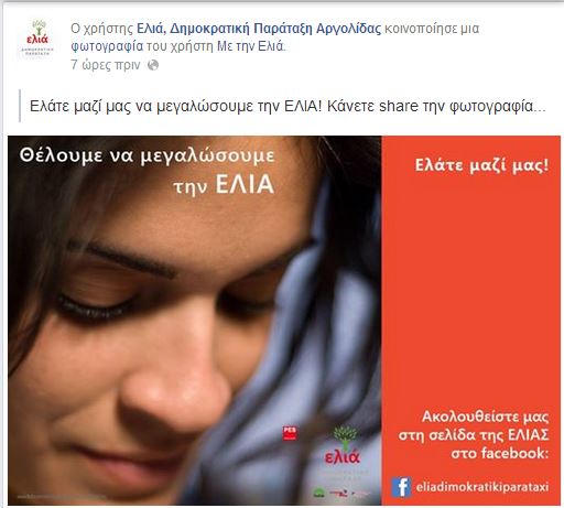 “Ελάτε μαζί μας να μεγαλώσουμε την Ελιά! Κάνετε share την φωτογραφία…” καλεί τον κόσμο ο διαχειριστής της σελίδας “Ελιά, Δημοκρατική Παράταξη Αργολίδας” στο Facebook.