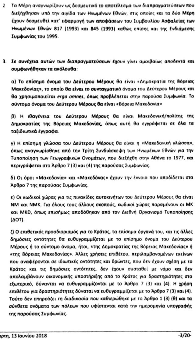 3. Αναφορικά με την ΠΓΔΜ, με αυτούς τους όρους νοούνται η επικράτεια, η γλώσσα, ο πληθυσμός και τα χαρακτηριστικά τους, με τη δική τους ιστορία, πολιτισμό και κληρονομιά, διακριτώς διαφορετικά από αυτά που αναφέρονται στο παραπάνω εδάφιο (άρθρο 7.2)