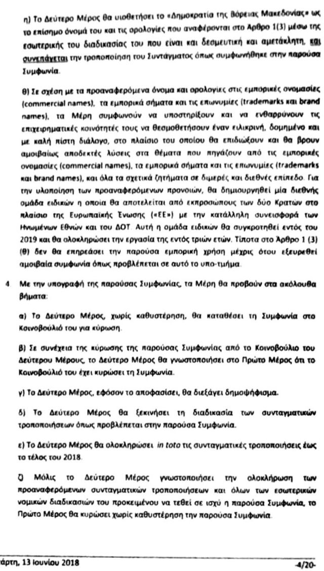 1. Το επίσημο όνομα θα είναι «Δημοκρατία της Βόρειας Μακεδονίας», το οποίο θα είναι το συνταγματικό όνομα και θα χρησιμοποιείται erga omnes, όπως προβλέπεται στη συμφωνία.