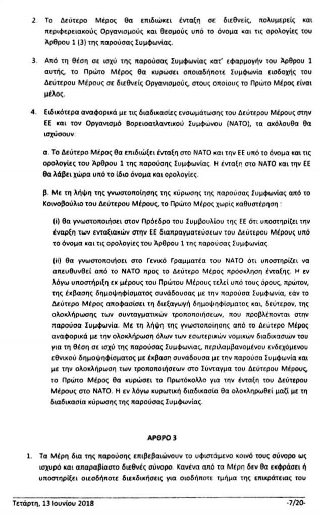 Στο άρθρο 2 της συμφωνίας προβλέπεται ότι η Ελλάδα δεν θα αντιταχθεί στην ένταξη της γείτονος υπό το νέο όνομα και τις ορολογίες σε διεθνείς, πολυμερείς και περιφερειακούς οργανισμούς και θεσμούς που η Ελλάδα είναι μέλος.
