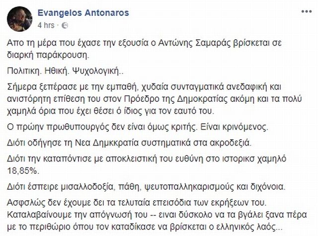 Σε διαρκή παράκρουση από τότε που έχασε την εξουσία, βρίσκεται ο Αντώνης Σαμαράς, σύμφωνα με τα νέα πυρά που εκτόξευσε ο Ευάγγελος Αντώναρος μέσω του προσωπικού του λογαριασμού στο Facebook.