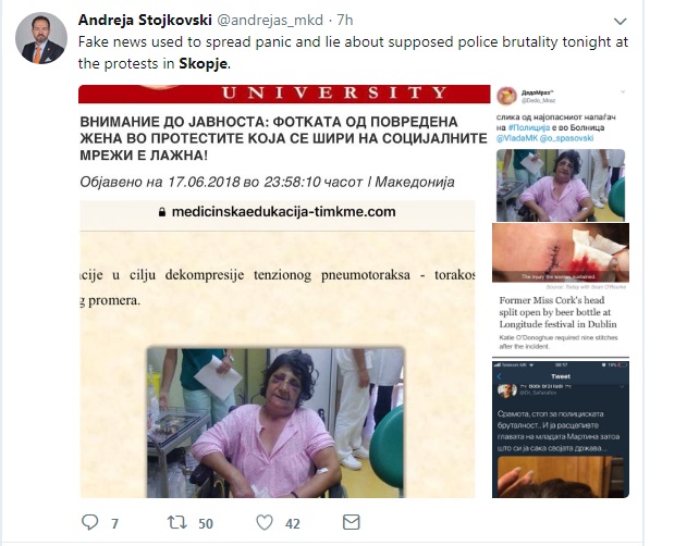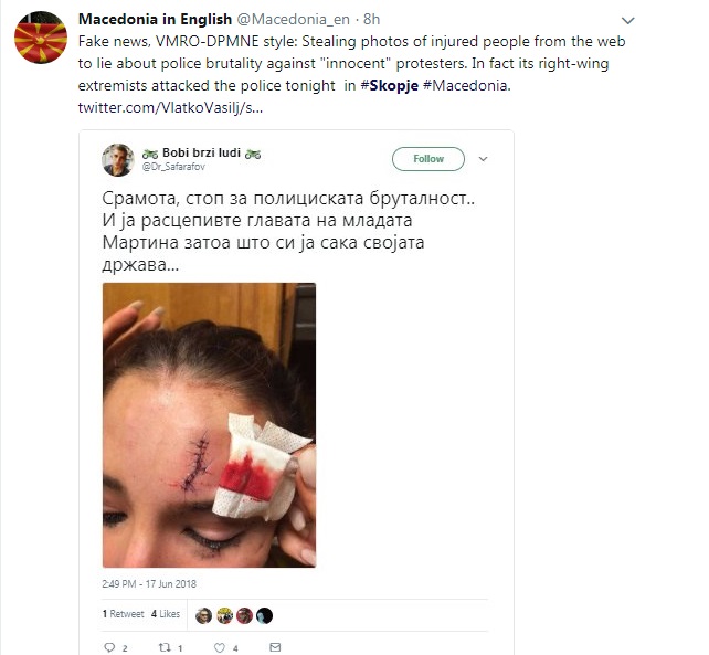 Την ώρα που στο διαδίκτυο έξαλλοι ακροδεξιοί διέδιδαν την ψευδή είδηση ότι υπήρχε «νεκρή διαδηλώτρια» στις Πρέσπες, που «έπεσε για τη Μακεδονία», Σκοπιανοί ομοϊδεάτες τους διακινούσαν τη φωτογραφία μιας χτυπημένης γυναίκας από τη σκοπιανή Αστυνομία, που έλεγαν ότι είχε ξυλοκοπηθεί για τη (δική της) «Μακεδονία».