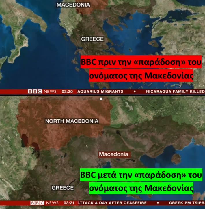Σε ρεπορτάζ του BBC για το «Μακεδονικό», ως απάντηση σε όσους ισχυρίζονται ότι η Ελλάδα «παρέδωσε» το όνομα «Μακεδονία», αναφέρεται η εκπρόσωπος Τύπου του ΣΥΡΙΖΑ, Ράνια Σβίγκου, σε ανάρτησή της στο twitter, παραθέτοντας εικόνες, με τους χάρτες της περιοχής, όπως παρουσιάζονται από το τηλεοπτικό δίκτυο BBC, πριν και μετά τη συμφωνία.