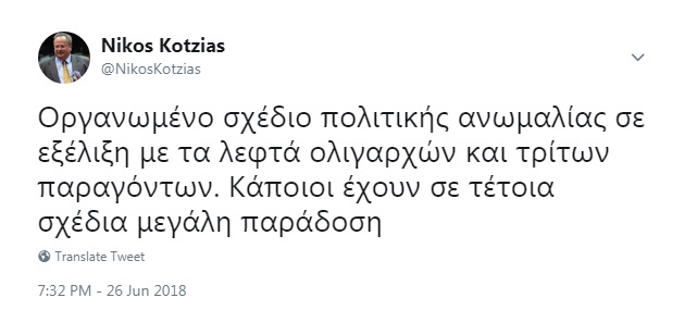 Για «οργανωμένο σχέδιο πολιτικής ανωμαλίας» που βρίσκεται «σε εξέλιξη »κάνει λόγο ο υπουργός Εξωτερικών Νίκος Κοτζιάς με ένα tweet στον προσωπικό του λογαριασμό στο Twitter με αφορμή την ανεξαρτητοποίηση του Γιώργου Λαζαρίδη από την Κ.Ο. των ΑΝΕΛ.
