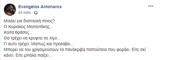 Σφοδρή επίθεση του Ευάγγελου Αντώναρου προσωπικά στον Κυριάκο Μητσοτάκη, για τον οποίο γράφει, μεταξύ άλλων, ότι «Θα τρέχει να κρυφτεί σε λίγο».