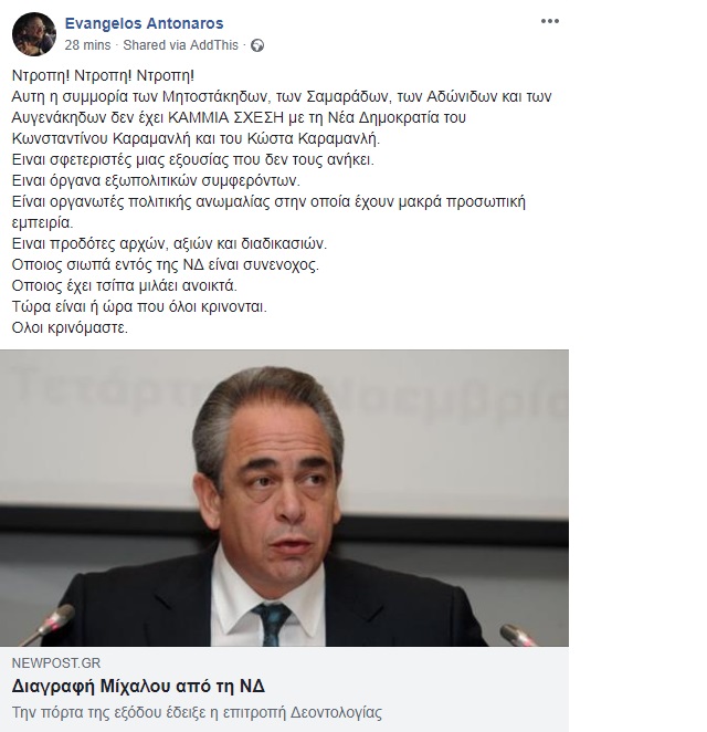 Λίγα λεπτά αργότερα, σχολιάζοντας την είδηση της διαγραφής του Κωνσταντίνου Μίχαλου από τη Νέα Δημοκρατία, ο Ευάγγελος Αντώναρος έγραψε:
