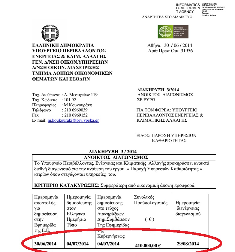 Πρόκειται για την απόφαση του ΥΠΕΚΑ με ΑΔΑ: 7ΖΛ10-Η2Τ, η οποία έχει αναρτηθεί και στο Διαδίκτυο και φέρει την υπογραφή της γενικής γραμματέως του υπουργείου Κωνσταντίνας Γιαννακόπούλου. Με αυτή το υπουργείο προκηρύσσει ανοικτό διαγωνισμό για την ανάθεσή του έργου «Παροχή Υπηρεσιών Καθαριότητας» κτιρίων όπου στεγάζονται οι υπηρεσίες του. Με λίγα λόγια ιδιώτες θα αναλάβουν τον καθαρισμό των γραφείων του ΥΠΕΚΑ, έναντι γενναίας αμοιβής.