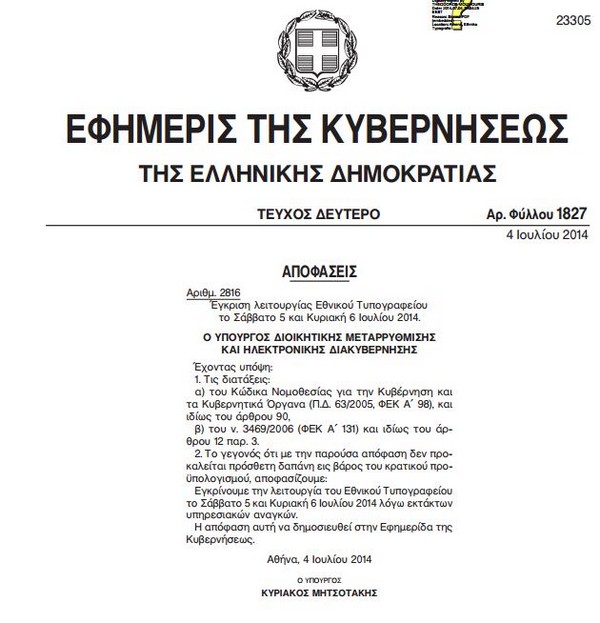 “Εγκρίνουμε την λειτουργία του Εθνικού Τυπογραφείου το Σάββατο 5 και Κυριακή 6 Ιουλίου 2014 λόγω εκτάκτων υπηρεσιακών αναγκών” αναφέρει το ΦΕΚ που υπογράφει ο αρμόδιος υπουργός Διοικητικής Μεταρρύθμισης.