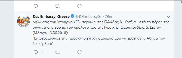 «Δηλώσεις του υπουργού Εξωτερικών της Ελλάδας Ν. Κοτζιά, μετά το πέρας της συνάντησής του με τον ομόλογό του της Ρωσικής Ομοσπονδίας, S. Lavrov (Μόσχα, 13.06.2018): “Επιβεβαιώσαμε την πρόσκληση στον ομόλογό μου να έρθει στην Αθήνα τον Σεπτέμβριο”», σημείωνε στην ανάρτησή της η Ρωσική Πρεσβεία.