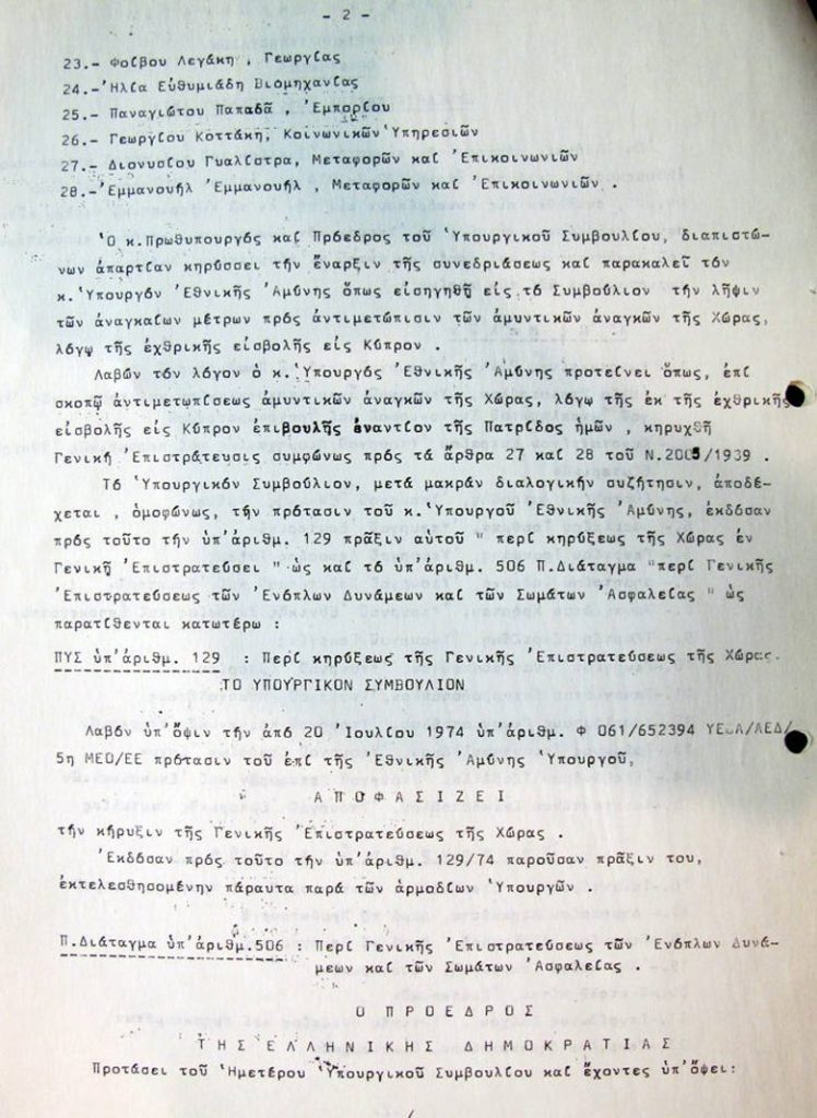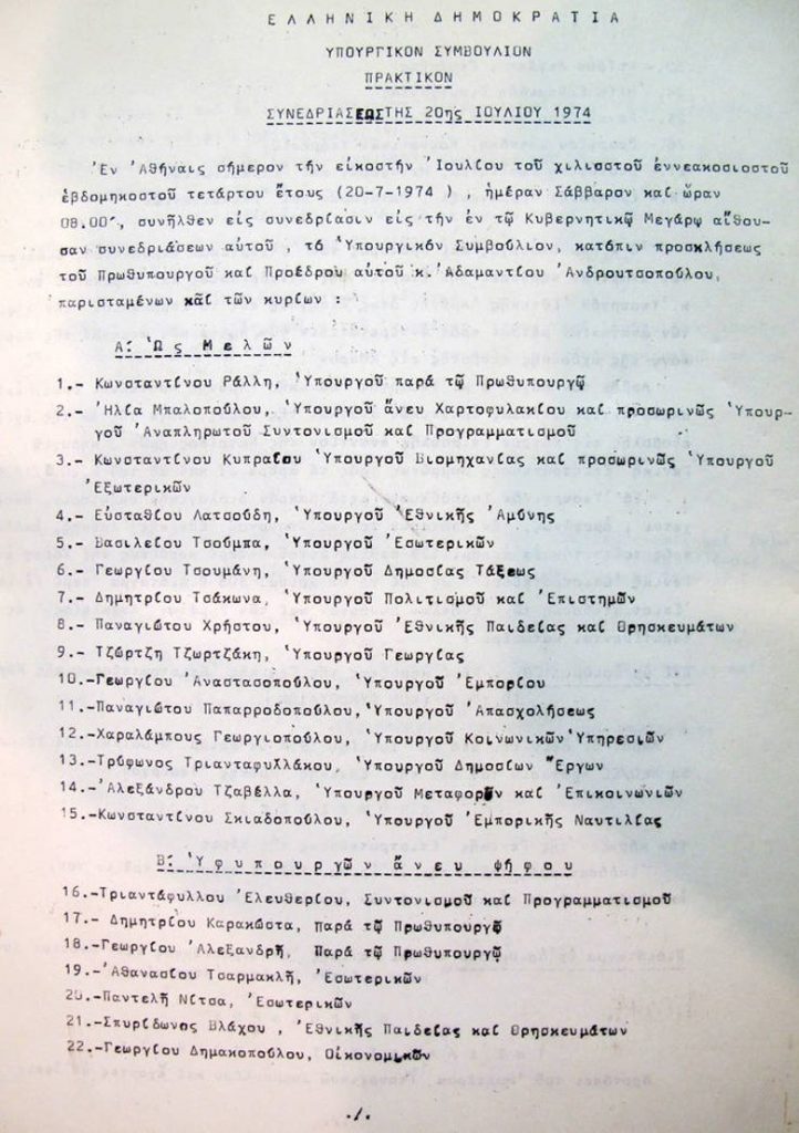 Πρακτικά συνεδρίασης του Υπουργικού Συμβουλίου της 20ης Ιουλίου 1974 υπό τον Πρωθυπουργό Αδαμάντιο Ανδρουτσόπουλο, όπου αποφασίζεται η κήρυξη «της Γενικής Επιστρατεύσεως της χώρας» και Πράξη Υπουργικού Συμβουλίου με τις υπογραφές των συμμετεχόντων στο Υπουργικό Συμβούλιο.