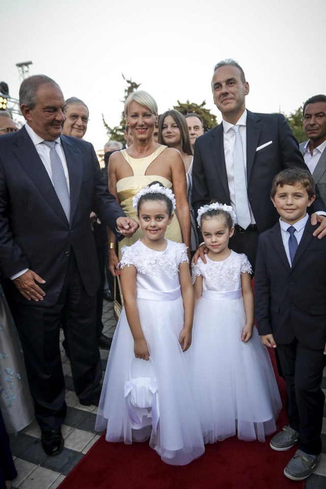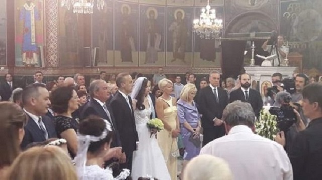 Ο γάμος έγινε φυσικά στη Γλυφάδα, στον ιερό Ναό του Αγίου Κωνσταντίνου και η νύφη, κόρη του πρώην εισαγγελέα Εφετών Ισίδωρου Ντογιάκου, έφτασε μαζί με τον πατέρα της στην εκκλησία.