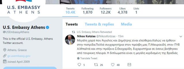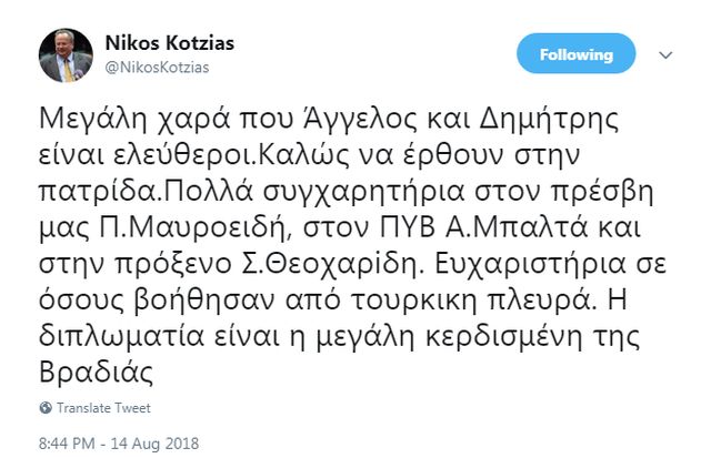 Με ανάρτησή του στο twitter ο Νίκος Κοτζιάς ευχαρίστησε τους Έλληνες διπλωμάτες που συνέβαλαν στην απελευθέρωση των δύο ανδρών μας.