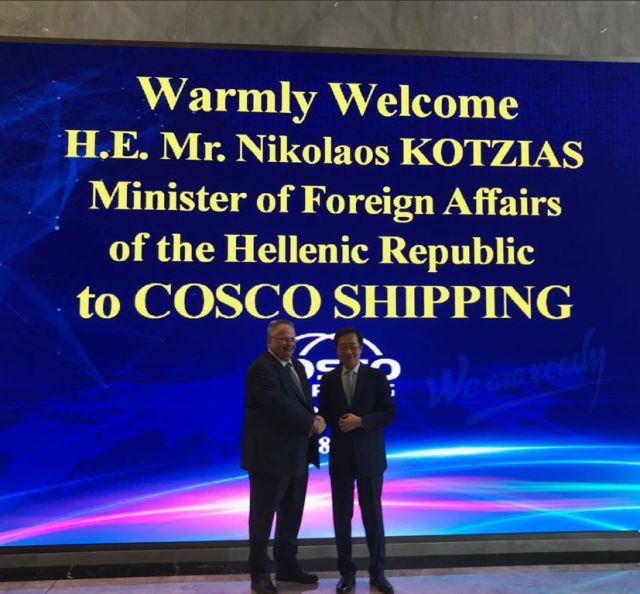 Προτού αναχωρήσει για τη Βιέννη, όπου θα συμμετάσχει στην άτυπη συνάντηση των υπουργών Εξωτερικών της Ε.Ε., ο κ. Κοτζιάς συναντήθηκε με τον πρόεδρο της Cosco, Xu Lirong, στην έδρα της εταιρείας.