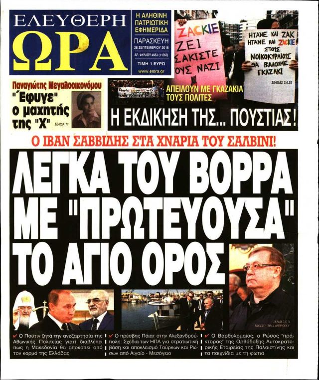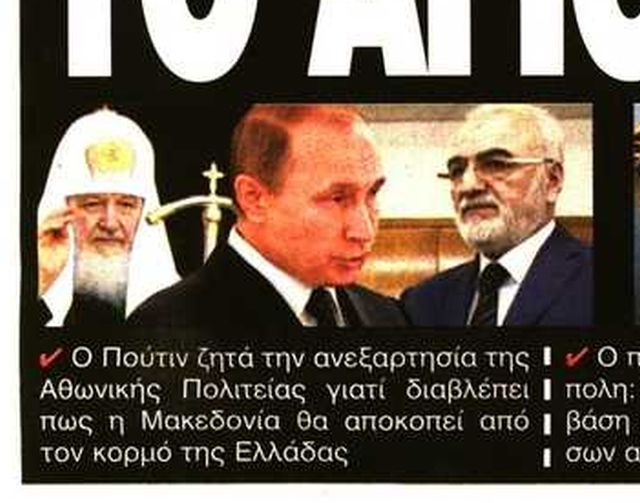 Καθόλου όμως γραφικό δεν είναι το σημερινό πρωτοσέλιδο της γραφικής «Ελεύθερης Ώρας», η οποία προαναγγέλλει διχοτόμηση της πατρίδας μας και το προβάλλει ως κάτι που το γνωρίζει ο Βλάντιμιρ Πούτιν ο αρκουδοκαβαλάρης για αυτό και κινεί το θέμα του Αγίου Όρους.