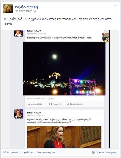 Στη δεύτερη η ανεξάρτητη βουλευτής είχε ανεβάσει μια φωτογραφία από ένα beach party στη Λίνδο με το εξής σχόλιο: “Beach party, μοναδικό”.΄