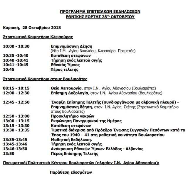 Στο πλαίσιο του εορτασμού της Εθνικής Εορτής της 28ης Οκτωβρίου, πρόκειται να διοργανωθεί επίσημη Τελετή Μνήμης προς Τιμήν των Ελλήνων Πεσόντων Στρατιωτικών κατά τον Ελληνο-Ιταλικό πόλεμο (1940-1941), την Κυριακή, 28 Οκτωβρίου 2018, στις 10.00 π.μ. στο Στρατιωτικό Κοιμητήριο Κλεισούρας και στις 12.00 στο Ιστορικό Στρατιωτικό Κοιμητήριο Βουλιαρατών.