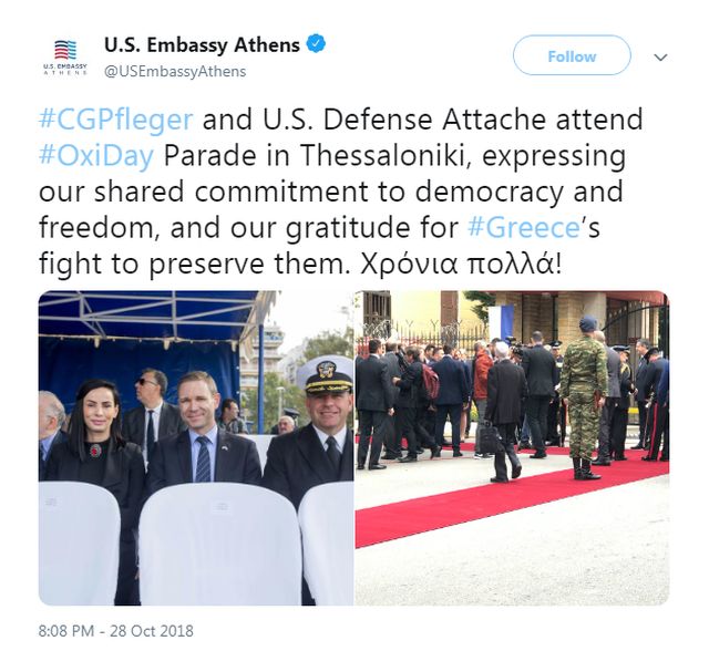 Με ανάρτησή της στο Twitter η Αμερικανική Πρεσβεία έγραψε ότι ο Πρόξενος και ο Στρατιωτικός Ακόλουθος παρακολούθησαν την παρέλαση της Ημέρας του «ΟΧΙ» στη Θεσσαλονίκη, «εκφράζοντας την κοινή μας αφοσίωση στη Δημοκρατία και στην Ελευθερία και την ευγνωμοσύνη μας στον αγώνα της Ελλάδας για την υπεράσπισή τους».