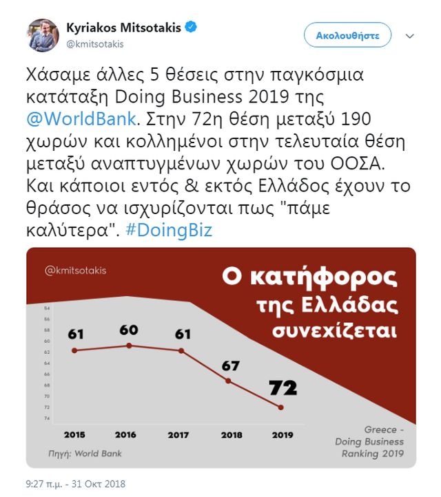 «Χάσαμε άλλες 5 θέσεις στην παγκόσμια κατάταξη Doing Business 2019 της @WorldBank.