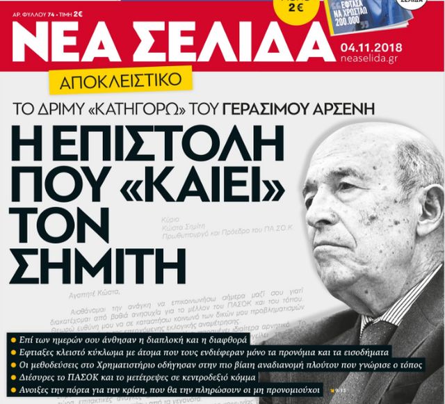 Την επιστολή, που «καίει» τον Κώστα Σημίτη, δημοσιεύει η εφημερίδα «Νέα Σελίδα».