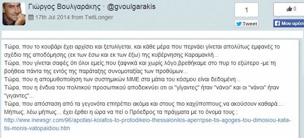 Δείτε τι έγραψε ο Γιώργος Βουλγαράκης στο twitter: