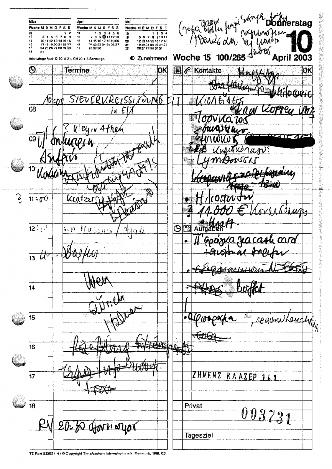 Στη σελίδα 3 Φεβρουαρίου 2003 υπαρχει σημείωση “PC Μητσοτάκη”, στις 26 Μαΐου της ίδιας χρονιάς σημείωση “Brief Μητσοτάκης”, ενώ στη σελίδα της 24ης Οκτωβρίου 2003 υπάρχει σημείωση “δώρο Μητσοτάκη”.