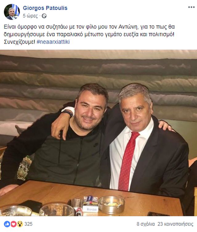 «Είναι όμορφο να συζητάω με τον φίλο μου τον Αντώνη, για το πως θα δημιουργήσουμε ένα παραλιακό μέτωπο γεμάτο ευεξία και πολιτισμό! Συνεχίζουμε! #neaarxiattiki».
