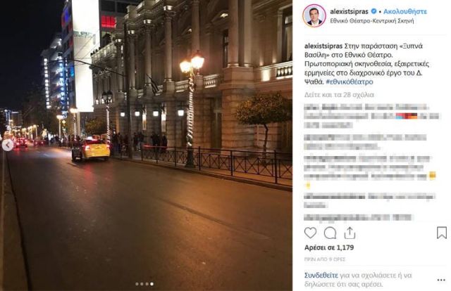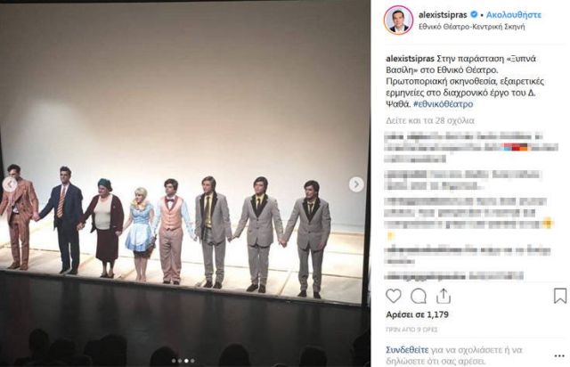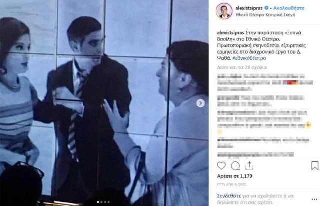 «Στην παράσταση Ξυπνά Βασίλη στο Εθνικό Θέατρο. Πρωτοποριακή σκηνοθεσία, εξαιρετικές ερμηνείες στο διαχρονικό έργο του Δ. Ψαθά» ήταν το σχόλιο που συνόδευσε τις φωτογραφίες του Αλέξη Τσίπρα στο Instagram.