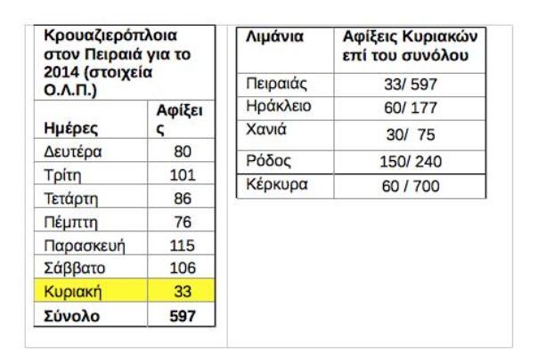 Αλήθεια: Οι κρουαζιέρες αποβιβάζουν κυρίως τουρίστες τους θερινούς μήνες στα νησιά, όπου έχει προβλεφθεί το άνοιγμα των καταστημάτων από τις αποφάσεις των αντιπεριφερειαρχών. Όπως φαίνεται από τα στοιχεία των λιμένων στους παρακάτω πινάκες, οι Κυριακάτικες αφίξεις είναι ελάχιστες και μάλιστα με αυθημερόν αναχώρηση. Στο Λιμάνι του Πειραιά κατά τη διάρκεια του έτους πραγματοποιούνται μόλις 33 αφίξεις από το σύνολο των 597 και μάλιστα οι 16 είναι τους μήνες από Ιούνιο έως Αύγουστο.