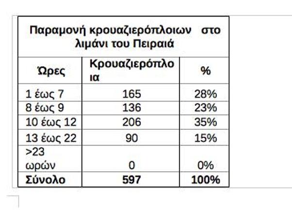 Ειδικά στα αστικά κέντρα η παραμονή των τουριστών κρουαζιέρας διαρκεί μόνο λίγες ώρες- συνήθως για επίσκεψη σε αρχαιολογικούς χώρους (ακρόπολη, μουσεία κλπ) καθώς δεν υπάρχουν οι κατάλληλες υποδομές στάθμευση που απαιτούνται για τη στάθμευση 15-20 τουριστικών λεωφορείων αλλά και επειδή η διάρκεια παραμονής σε ώρες είναι εξαιρετικά περιορισμένη. Όπως φαίνεται στον πίνακα, πάνω από το 50% των αφίξεων στο λιμάνι του Πειραιά διαμένει έως 9 ώρες.