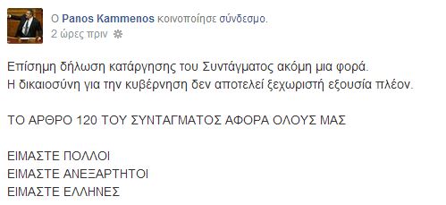 Με μία πολύ σκληρή ανάρτηση στο facebook ο Πάνος Καμμένος καταγγέλει τον υπουργό Οικονομικών Γκίκα Χαρδούβελη ότι με τις χθεσινές του δηλώσεις στον ΣΕΒ ουσιαστικά καταλύει το Σύνταγμα της χώρας.