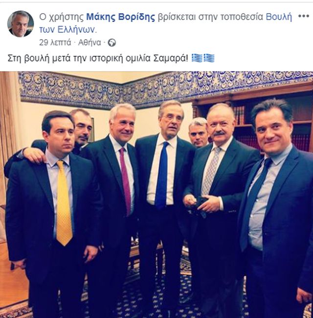 Μετά την ομιλία Σαμαρά στη Βουλή για τη Συμφωνία των Πρεσπών, στην οποία συνείσφερε πολλά ιστορικά στοιχεία που διάβασε στη Wikipedia, αληθή στοιχεία, η ενωμένη ακροδεξιά ΠΟΛΑΝ-ΛΑΟΣ έβγαλε αναμνηστική φωτογραφία.