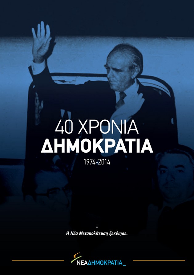Με αφορμή την συμπλήρωση 40 χρόνων από την μεταπολίτευση ο Αντώνης Σαμαράς θέλει να προβάλει το κεντρώο προφίλ του ιδρυτή της παράταξης σε μία στιγμή που ένα μεγάλο μέρος του κόμματος τον κατηγορεί για ακροδεξιά στροφή στο πολιτικό κομμάτι και στροφή στις σκληρές νεοφιλελεύθερες οικονομικές πολιτικές.