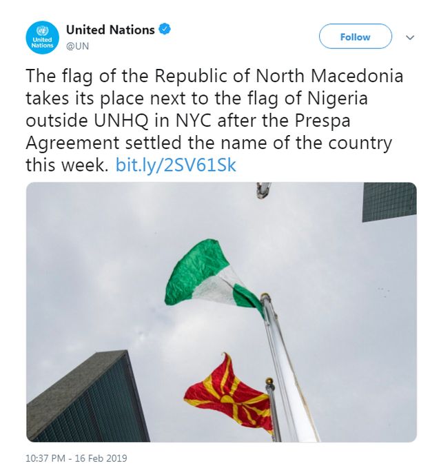 Με ανάρτησή τους τα Ηνωμένα Έθνη στο Twitter έκαναν επίσης γνωστό ότι η σημαία της Βόρειας Μακεδονίας υψώθηκε στο προαύλιο του ουρανοξύστη του ΟΗΕ, δίπλα στη σημαία της Νιγηρίας, ως αποτέλεσμα της Συμφωνίας των Πρεσπών.