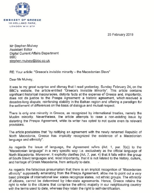 Την επιστολή διαμαρτυρίας στο BBC για το ρεπορτάζ περί «μακεδονικής μειονότητας» απέστειλε η ελληνική πρεσβεία στο Λονδίνο.