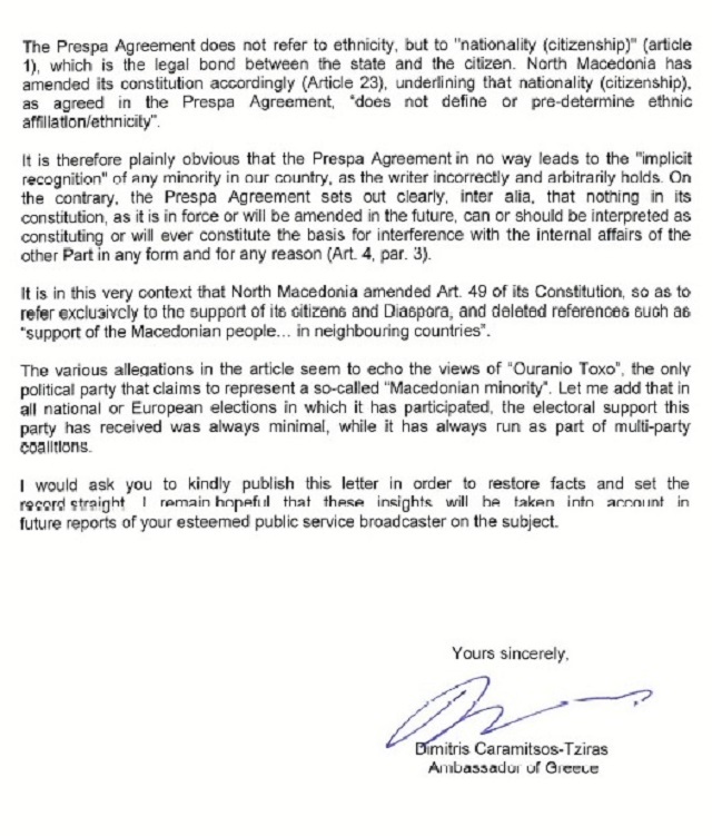 Ειδικότερα, στην επιστολή του o Έλληνας πρέσβης Δημήτρης Καραμήτσος – Τζιράς εκφράζει στο βρετανικό δίκτυο την έκπληξη και απογοήτευση της ελληνικής κυβέρνησης για το δημοσίευμα, κάνοντας λόγο για ιστορικές ανακρίβειες, και επισημαίνοντας ότι δεν υφίσταται «μακεδονική μειονότητα» στην Ελλάδα.