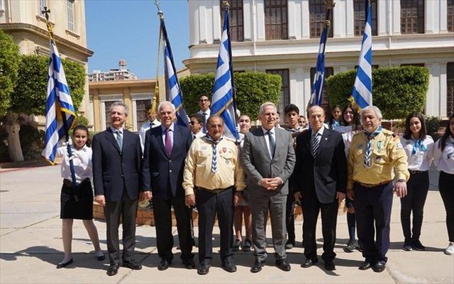 Με την ανάκρουση των εθνικών ύμνων, Ελλάδας και Αιγύπτου, τους Αιγυπτιώτες μαθητές των Ελληνικών Σχολείων της Αλεξάνδρειας να υψώνουν την ελληνική σημαία, το ιστορικό σώμα των Ελλήνων Προσκόπων της πόλης να δίνει το δυναμικό παρών, και με την παρουσία εκπροσώπων όλων των παροικιακών σωματείων και απλού κόσμου, η πρεσβυγενής Ελληνική Κοινότητα Αλεξανδρείας υποδέχτηκε το μεσημέρι της Παρασκευής, τον υπουργό Εθνικής Άμυνας Ευάγγελο Αποστολάκη, στο Ελληνικό Τετράγωνο του Σάτμπι.
