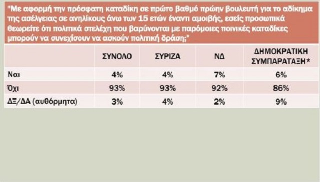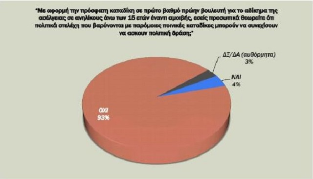 Συγκεκριμένα, το 93% πιστεύει ότι πρόσωπα που βαρύνονται με καταδίκες, όπως για ασέλγεια σε βάρος ανηλίκων, θα πρέπει να αποσύρονται οριστικά από την πολιτική δράση.
