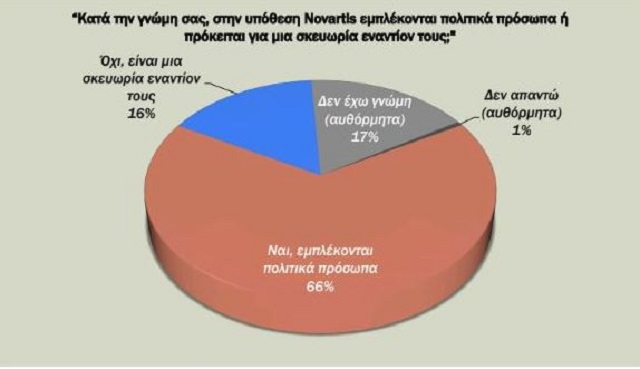 Όσο για την υπόθεση Novartis το 66%: πιστεύει ότι εμπλέκονται πολιτικά πρόσωπα, ενώ μόλις το 16% συμφωνεί με ΝΔ και ΚΙΝΑΛ πως η υπόθεση Novartis αποτελεί σκευωρία.