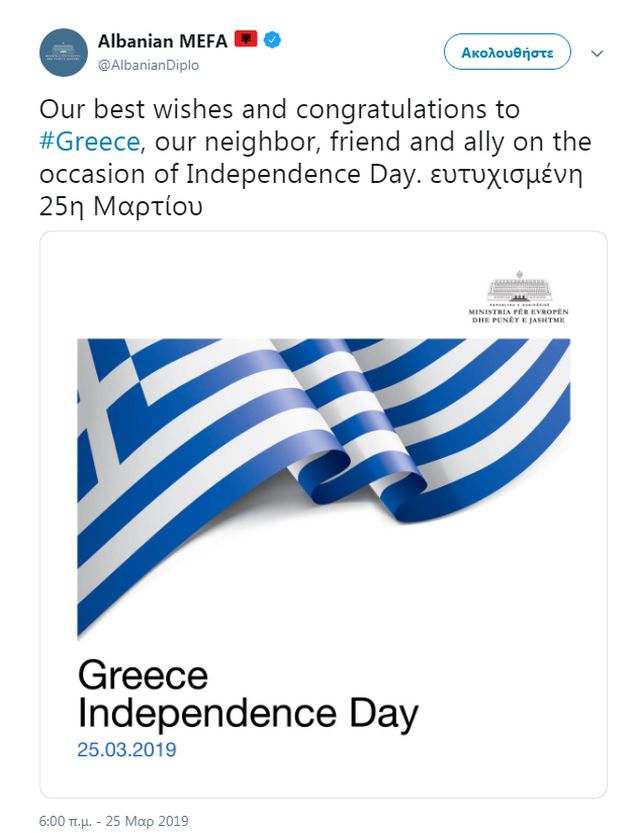 «Τις καλύτερες ευχές μας και τα συγχαρητήριά μας στην Ελλάδα τη γείτονα φίλη και σύμμαχο για την επέτειο της Ημέρας της Ανεξαρτησίας».