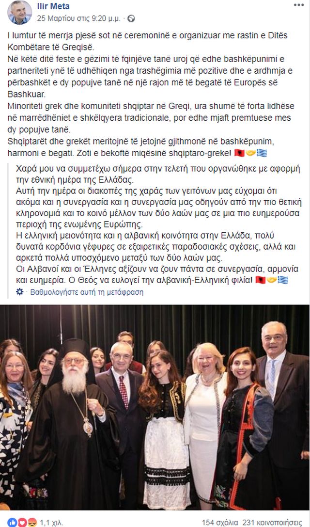 Στην ανάρτησή του ο Πρόεδρος της Αλβανίας αναφέρει: