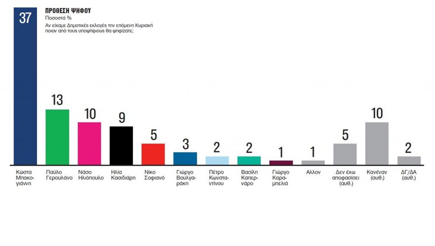 Προβάδισμα του Κώστα Μπακογιάννη στην κούρσα για τον Δήμο Αθηναίων και χαμηλά ποσοστά για τον υποψήφιο του ΣΥΡΙΖΑ καταγράφει νέα δημοσκόπηση.