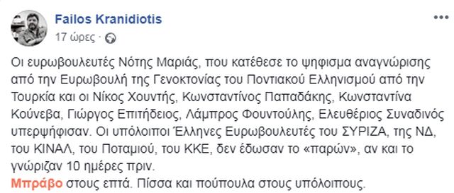 Ο πρόεδρος της Νέας Δεξιάς, Φαήλος Κρανιδιώτης, σχολίασε με ανάρτησή του στο Facebook τη μη ψήφιση της αναγνώρισης της Γενοκτονίας των Ποντίων από Έλληνες ευρωβουλευτές.