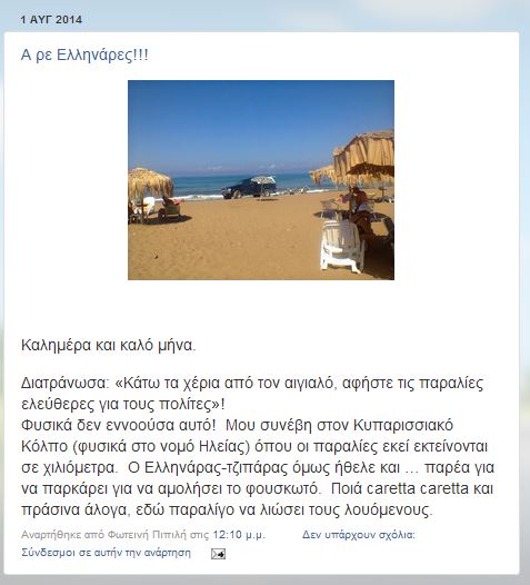 Ποδαρικό στον Αύγουστο με με καταγγελία έκανε η Φωτεινή Πιπιλή αφού ένας “Ελληνάρας” οδήγησε να γράψει καινούργιο post στο blog της.