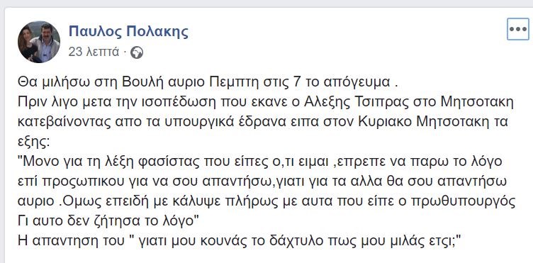 Ο ίδιος ο κ. Πολάκης με ανάρτησή του στην προσωπική του σελίδα στο Facebook, αποκάλυψε τις ακριβώς είπε στον Κυριάκο Μητσοτάκη: