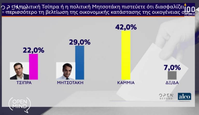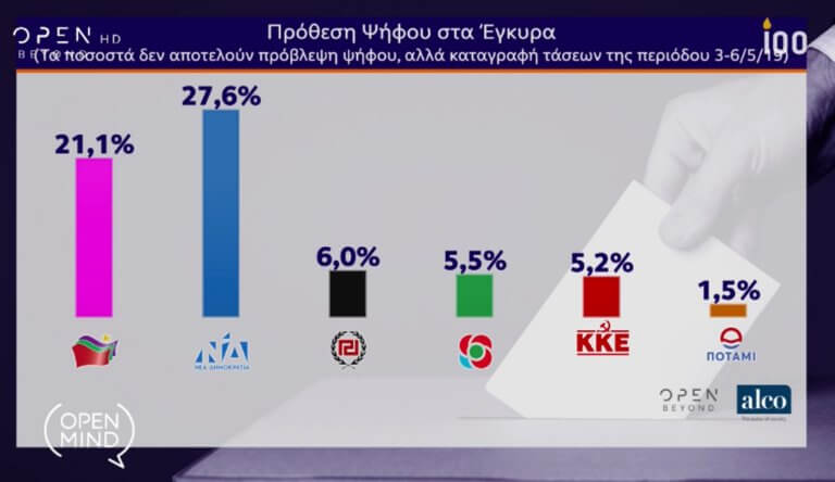 Στις 5,9 μονάδες είναι η διαφορά της Νέας Δημοκρατίας από τον ΣΥΡΙΖΑ στις επικείμενες ευηρωεκλογές σύμφωνα με την δημοσκόπηση της Alco που έγινε για λογαριασμό του Open.