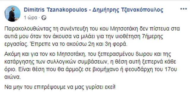«Παρακολουθώντας τη συνέντευξη του κου Μητσοτάκη δεν πίστευα στα αυτιά μου όταν τον άκουσα να μιλάει για την υιοθέτηση 7ήμερης εργασίας.