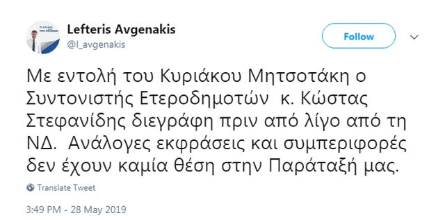 «Με εντολή του Κυριάκου Μητσοτάκη ο Συντονιστής Ετεροδημοτών κ. Κώστας Στεφανίδης διεγράφη πριν από λίγο από τη ΝΔ.