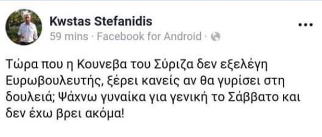 »Ψάχνω γυναίκα για γενική το Σάββατο και δεν έχω βρει ακόμα», έγραψε ο Κώστας Στεφανίδης, συντονιστής ετεροδημοτών Νέας Δημοκρατίας, όπως ανέφερε στο προφίλ του στο Facebook.