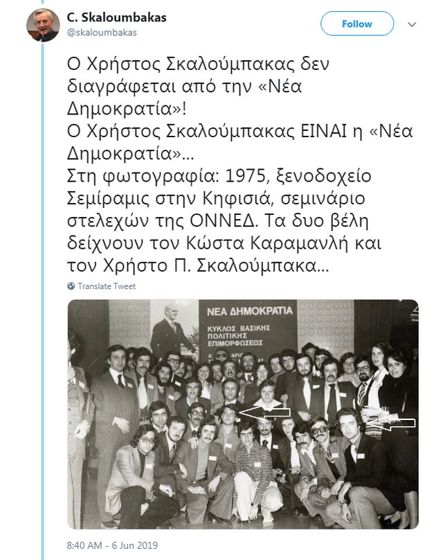 Ο Χρήστος Σκαλούμπακας, ο γιος του αρχιβασανιστή της Μακρονήσου, που διαγράφτηκε από τη Νέα Δημοκρατία, με ανάρτησή του στο Twitter δήλωσε ότι εκείνος είναι η Νέα Δημοκρατία.