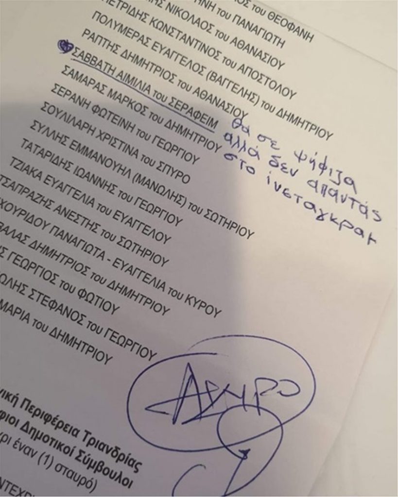 «Θα σε ψήφιζα αλλά δεν απαντάς στο ίνσταγκραμ», έγραψε πάνω στο ψηφοδέλτιο βάζοντας μια καρδούλα, αντί για σταυρό δίπλα στο όνομα της Αιμιλίας Σαββάτη.